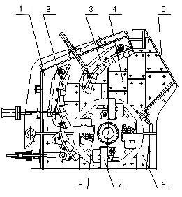 PF系列反擊式破碎機(jī)簡介: PF系列反擊式破碎機(jī)是我公司在吸收國內(nèi)外先進(jìn)技術(shù)基礎(chǔ)上精心設(shè)計(jì)出的新產(chǎn)品。該系列設(shè)備可處理粒度不大于500毫米、抗壓強(qiáng)度不超過320 兆帕的物料(花崗巖、石灰石、混凝土等),反擊式破碎機(jī)以其優(yōu)異的性能和良好的表現(xiàn),廣泛應(yīng)用于生產(chǎn)高等級公路、水電、人工砂石料、破碎、建筑等行業(yè)用石料。 PF系列反擊式破碎機(jī)理想的入料粒度為100-500mm,不得超過規(guī)定值。出料粒度用戶根據(jù)需要調(diào)整錘頭與反擊板、均整部件之間的間隙而達(dá)到。 反擊破工作原理: PF系列產(chǎn)品利用沖擊能破碎物料,工作時(shí),在電動(dòng)機(jī)的帶動(dòng)下,反擊式破碎機(jī)的轉(zhuǎn)子高速旋轉(zhuǎn),物料進(jìn)入后,與轉(zhuǎn)子上的板錘撞擊破碎,然后又被反擊到襯板上再次破碎,最后從出料口排出。用戶可調(diào)整反擊架和轉(zhuǎn)子架之間的間隙可達(dá)到改變物料出料粒度和物料形狀的目的。 反擊破性能特點(diǎn): 1.多腔均勻破碎,適宜破碎硬巖; 2.低矮的大進(jìn)料口,便于生產(chǎn)線布置和增大進(jìn)料尺寸; 3.新型耐磨材料使板錘、反擊板和襯板使用壽命長; 4.高鉻板錘、獨(dú)特的反擊襯板,尤其適用于硬巖破碎、高效節(jié)能; 5.硬巖破碎、高效節(jié)能; 6.均整板結(jié)構(gòu)使排料更呈小粒徑和立方體形,無內(nèi)紋; 7.產(chǎn)品形狀呈立方體,排料粒度大小可調(diào); 8.簡化破碎流程; 9.全液壓開啟,便于維修及更換易損件。 PF系列反擊式破碎機(jī)結(jié)構(gòu)圖: 1.后箱體 2.反擊襯板 3.反擊架 4.襯板 5.進(jìn)料口 6.底座 7.板錘 8.轉(zhuǎn)子架 PF系列反擊式破碎機(jī)外形尺寸圖: